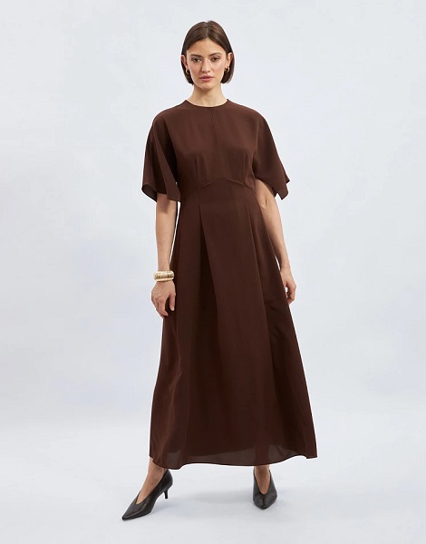 Платье малого объёма, расширенного к низу силуэта, отрезное по линии талии, с цельнокроеным рукавом, длиной выше щиколотки, без подкладки. Платье разделено на верхнюю и нижнюю части. По спинке линия прямая. По переду линия фигурная, направлена от боковых швов вверх к центру. Верхняя часть переда со средним швом. В среднем шве переда разрез. Нагрудная вытачка переведена в рельеф, расположенный ниже линии груди. Верхняя часть спинки со средним швом и талиевыми вытачками. Цельнокроеный рукав мягкой формы с умеренно углубленной проймой. В нижним шве рукава разрез. Длина рукава выше линии локтя. Нижняя часть переда с двумя талиевыми вытачками-складками. Нижняя часть спинки со средним швом и талиевыми вытачками. В нижней части платья боковой шов отсутствует, смоделирован бочок. Застежка в среднем шве спинки на потайную тесьму -молнию. Горловина круглой формы, обработана обтачкой.
